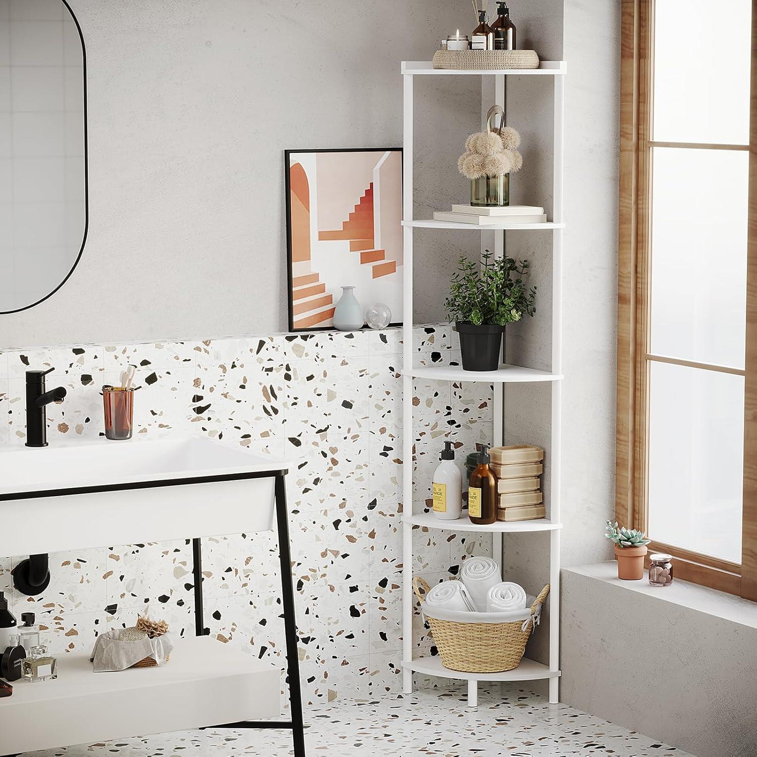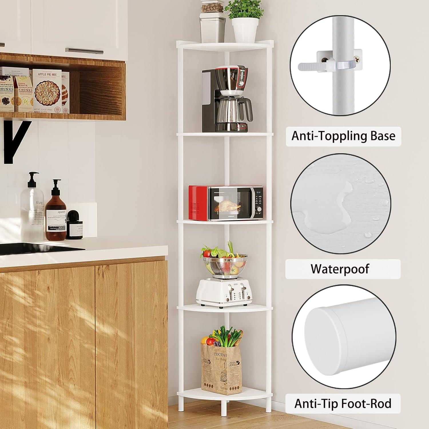 【Multifunctional Corner Shelf】: This storage shelves can be used as a corner bookshelf, display shelf, storage shelf or plant shelf in any corner of the living room, bedroom, home office, kitchen, hallway, balcony and bathroom. The 90° right-angle design of the standing shelf not only saves space, but also helps to turn unused corner space into functional storage space, perfectly fitting every corner.
