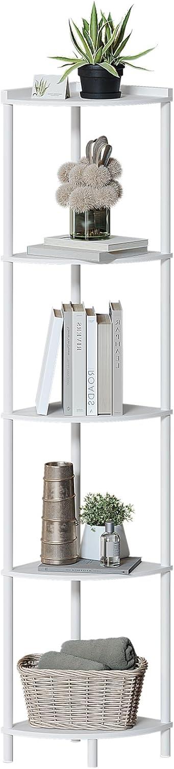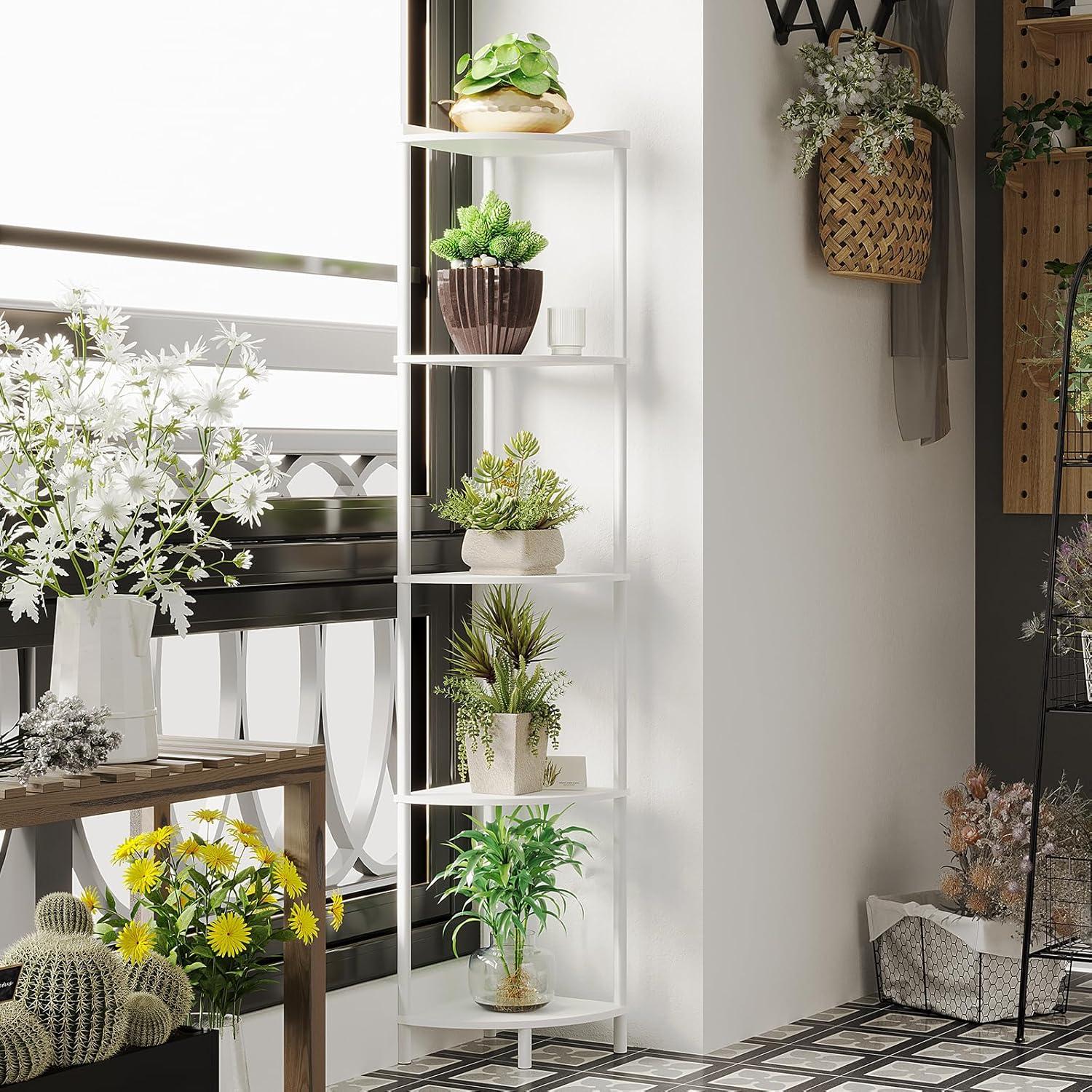 【5-Tier Large Storage Capacity Corner Shelves】: The height of the corner shelf stand is 64 inches, the shelf radius is 12.2 inches, and the space between shelves is 14.76 inches, this tall shelf provides you with ample storage space to store Your books, photo frames, decorations, centerpieces, potted plants and other household items.